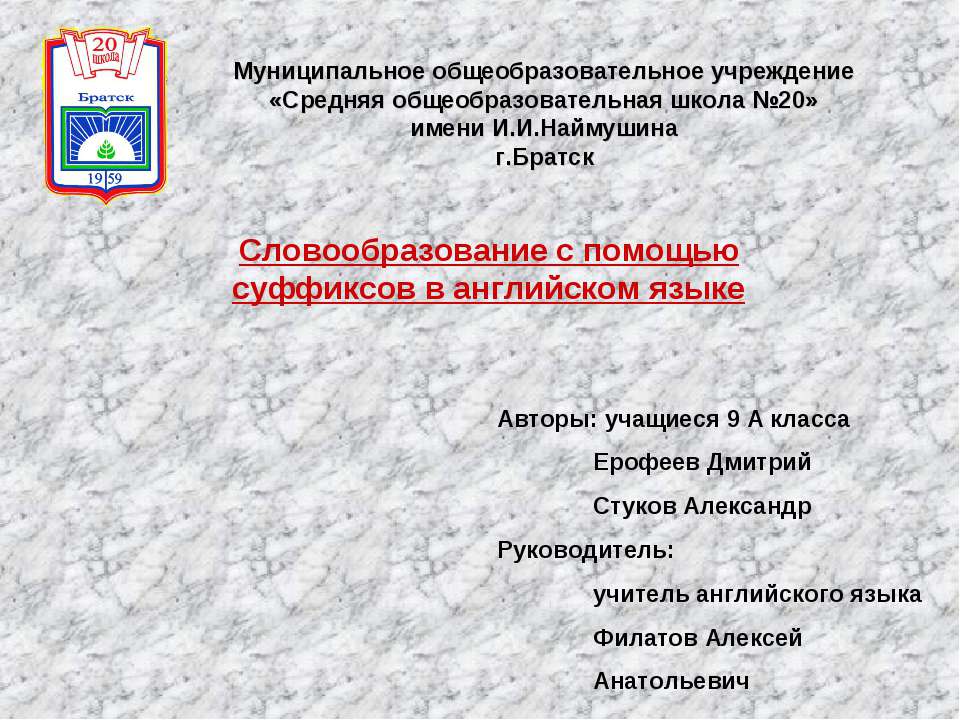 Словообразование с помощью суффиксов в английском языке Муниципальное общеобразовательное учреждение «Средняя общеобразовательная школа №20» имени И.И.Наймушина г.Братск Авторы: учащиеся 9 А класса Ерофеев Дмитрий Стуков Александр Руководитель: учитель английского языка Филатов Алексей Анатольевич