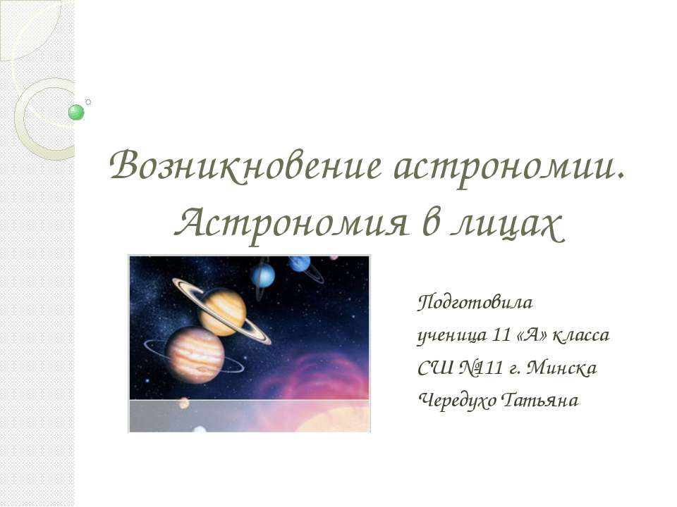 Возникновение астрономии. Астрономия в лицах Подготовила ученица 11 «А» класса СШ №111 г. Минска Чередухо Татьяна
