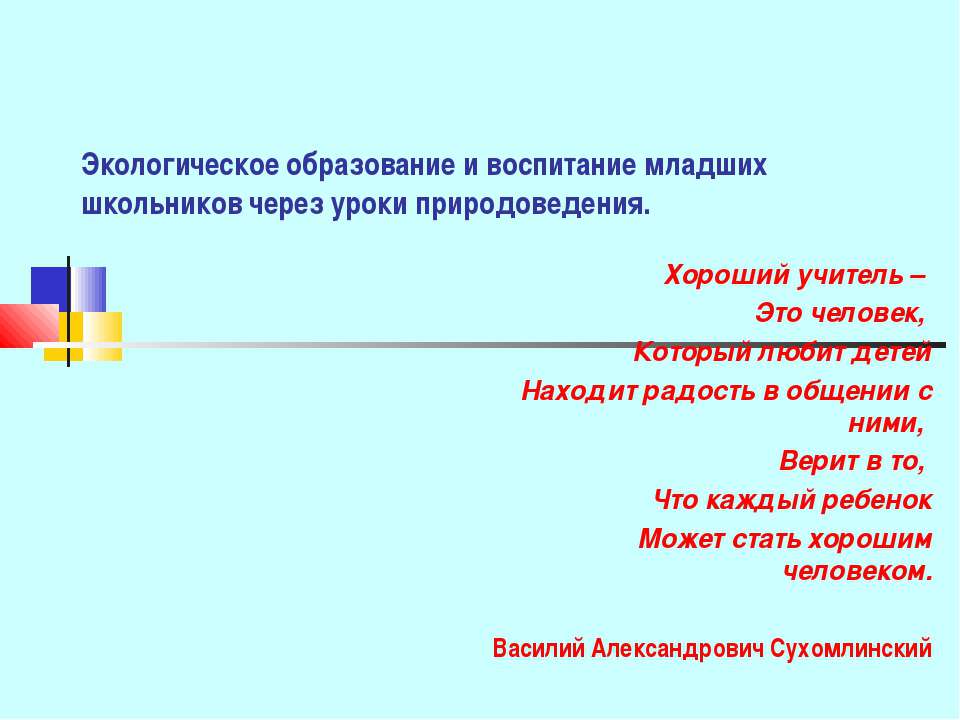 Экологическое образование и воспитание младших школьников через уроки природоведения. Хороший учитель – Это человек, Который любит детей Находит радость в общении с ними, Верит в то, Что каждый ребенок Может стать хорошим человеком. Василий Александрович Сухомлинский