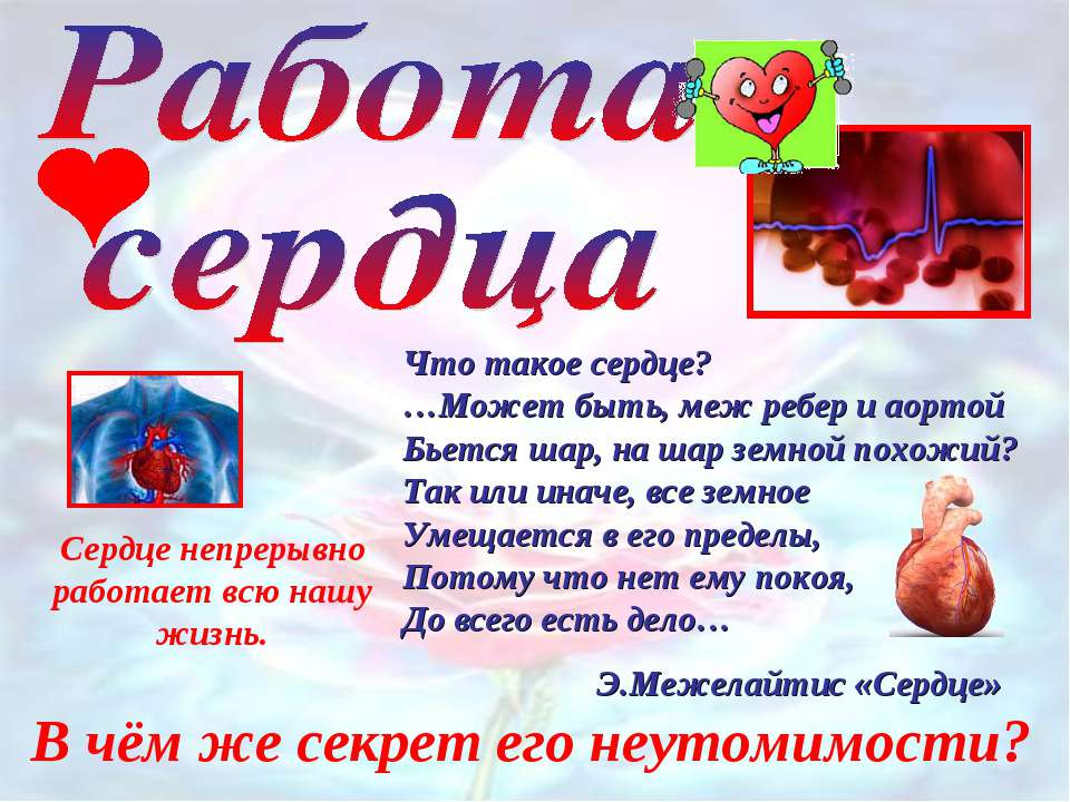 Что такое сердце? …Может быть, меж ребер и аортой Бьется шар, на шар земной похожий? Так или иначе, все земное Умещается в его пределы, Потому что нет ему покоя, До всего есть дело… Э.Межелайтис «Сердце» Сердце непрерывно работает всю нашу жизнь. В чём же секрет его неутомимости?