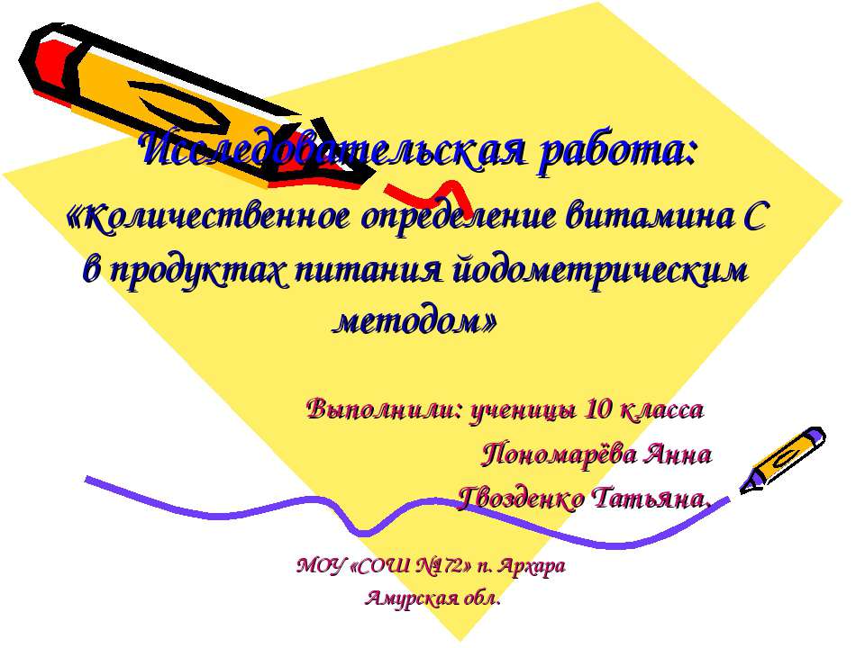 Исследовательская работа: «количественное определение витамина С в продуктах питания йодометрическим методом» Выполнили: ученицы 10 класса Пономарёва Анна Гвозденко Татьяна. МОУ «СОШ №172» п. Архара Амурская обл.