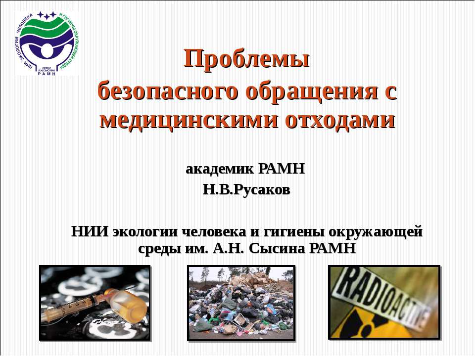 Проблемы безопасного обращения с медицинскими отходами академик РАМН Н.В.Русаков НИИ экологии человека и гигиены окружающей среды им. А.Н. Сысина РАМН