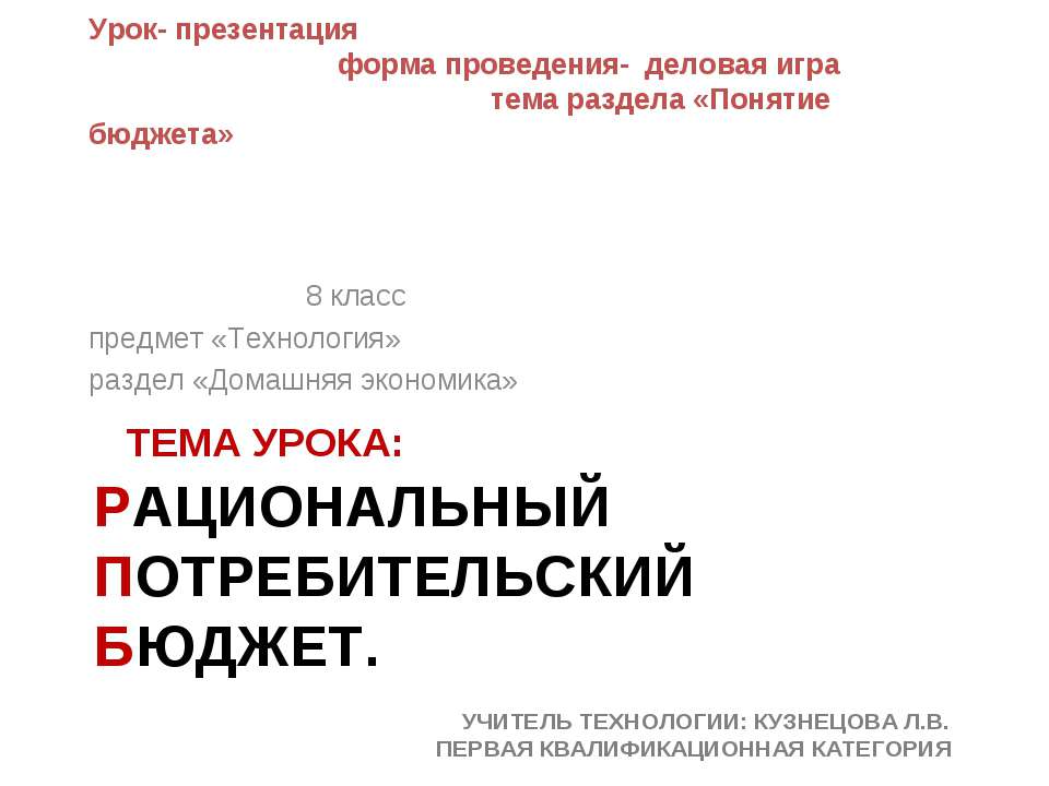 ТЕМА УРОКА: РАЦИОНАЛЬНЫЙ ПОТРЕБИТЕЛЬСКИЙ БЮДЖЕТ. УЧИТЕЛЬ ТЕХНОЛОГИИ: КУЗНЕЦОВА Л.В. ПЕРВАЯ КВАЛИФИКАЦИОННАЯ КАТЕГОРИЯ Урок- презентация форма проведения- деловая игра тема раздела «Понятие бюджета» 8 класс предмет «Технология» раздел «Домашняя экономика»