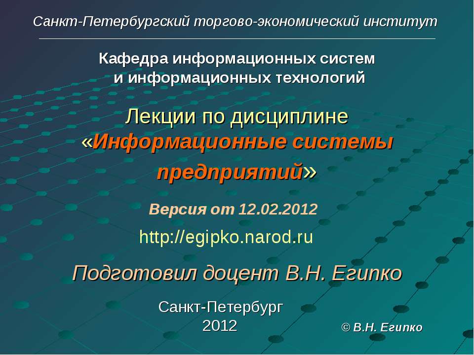 Лекции по дисциплине «Информационные системы предприятий» Подготовил доцент В.Н. Египко Санкт-Петербург 2012 Санкт-Петербургский торгово-экономический институт Кафедра информационных систем и информационных технологий © В.Н. Египко Версия от 12.02.2012 http://egipko.narod.ru