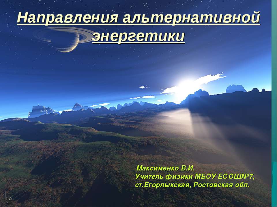 Направления альтернативной энергетики Максименко В.И. Учитель физики МБОУ ЕСОШ№7, ст.Егорлыкская, Ростовская обл.