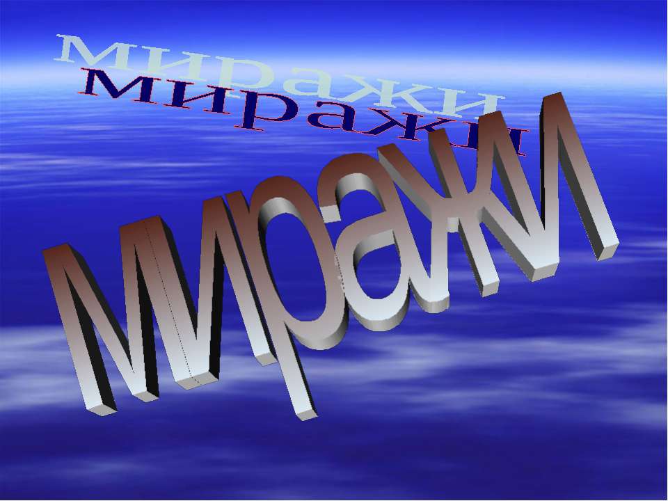 Вывод Мираж - это оптическое явление, показывающее в более или менее искажённой форме предметы, расположенные на самом деле не в том месте, где мы видим их изображение. Вывод:
