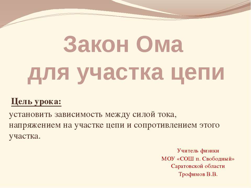 Закон Ома для участка цепи Цель урока: установить зависимость между силой тока, напряжением на участке цепи и сопротивлением этого участка. Учитель физики МОУ «СОШ п. Свободный» Саратовской области Трофимов В.В.