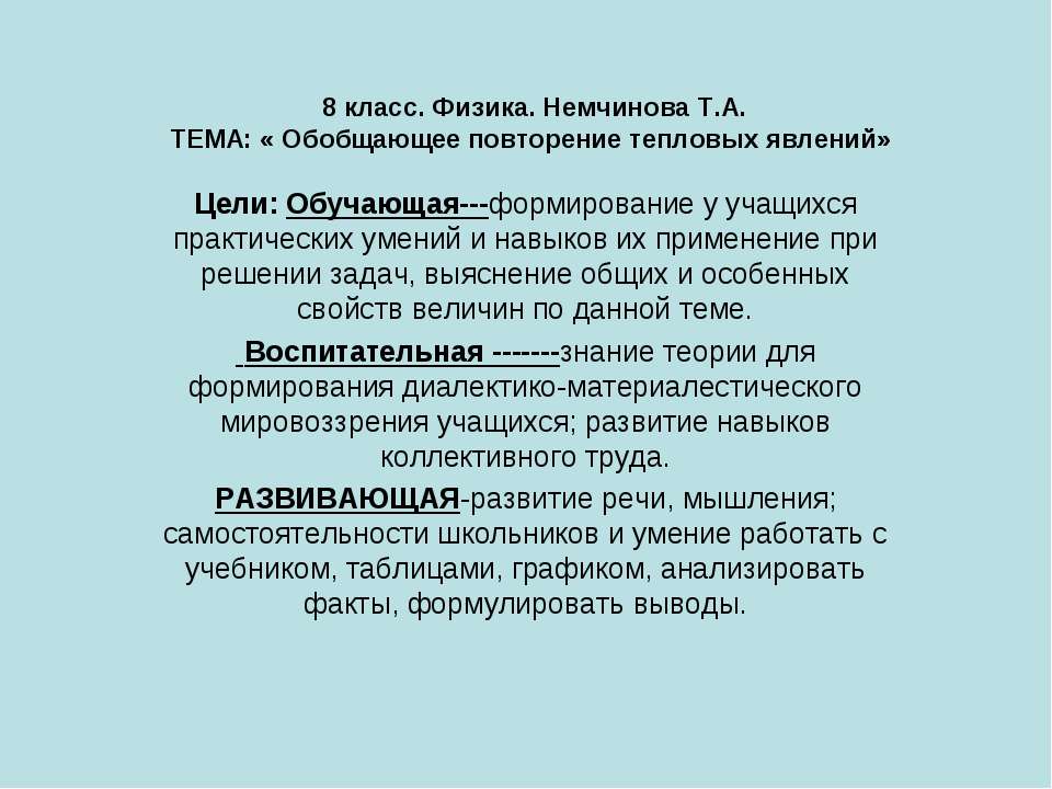 8 класс. Физика. Немчинова Т.А. ТЕМА: « Обобщающее повторение тепловых явлений» Цели: Обучающая---формирование у учащихся практических умений и навыков их применение при решении задач, выяснение общих и особенных свойств величин по данной теме. Воспитательная -------знание теории для формирования диалектико-материалестического мировоззрения учащихся; развитие навыков коллективного труда. РАЗВИВАЮЩАЯ-развитие речи, мышления; самостоятельности школьников и умение работать с учебником, таблицами, графиком, анализировать факты, формулировать выводы.