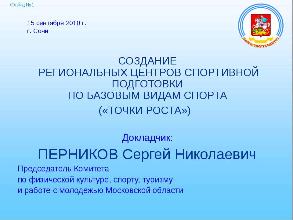 СОЗДАНИЕ РЕГИОНАЛЬНЫХ ЦЕНТРОВ СПОРТИВНОЙ ПОДГОТОВКИ ПО БАЗОВЫМ ВИДАМ СПОРТА («ТОЧКИ РОСТА») Докладчик: ПЕРНИКОВ Сергей Николаевич Председатель Комитета по физической культуре, спорту, туризму и работе с молодежью Московской области 15 сентября 2010 г. г. Сочи Слайд №1