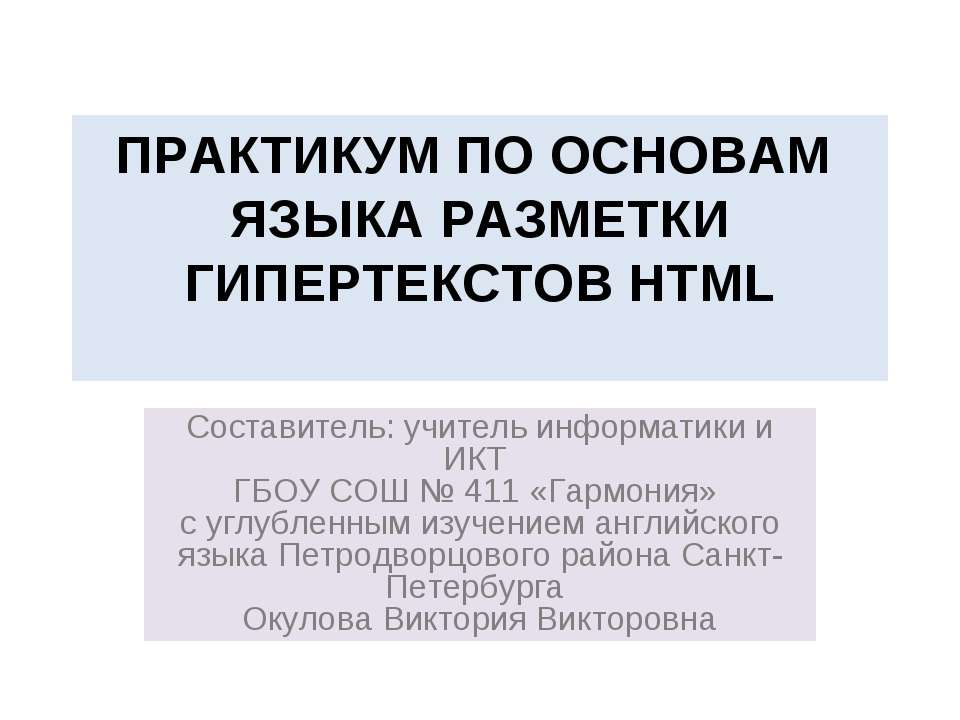 ПРАКТИКУМ ПО ОСНОВАМ ЯЗЫКА РАЗМЕТКИ ГИПЕРТЕКСТОВ HTML Составитель: учитель информатики и ИКТ ГБОУ СОШ № 411 «Гармония» с углубленным изучением английского языка Петродворцового района Санкт-Петербурга Окулова Виктория Викторовна