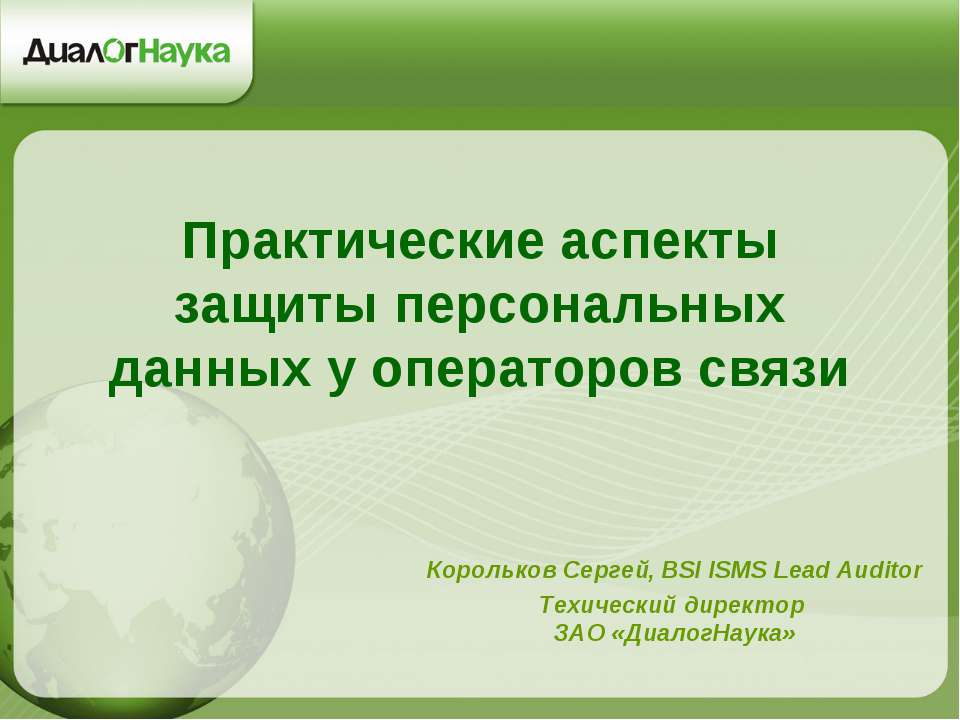 Практические аспекты защиты персональных данных у операторов связи Корольков Сергей, BSI ISMS Lead Auditor Техический директор ЗАО «ДиалогНаука»