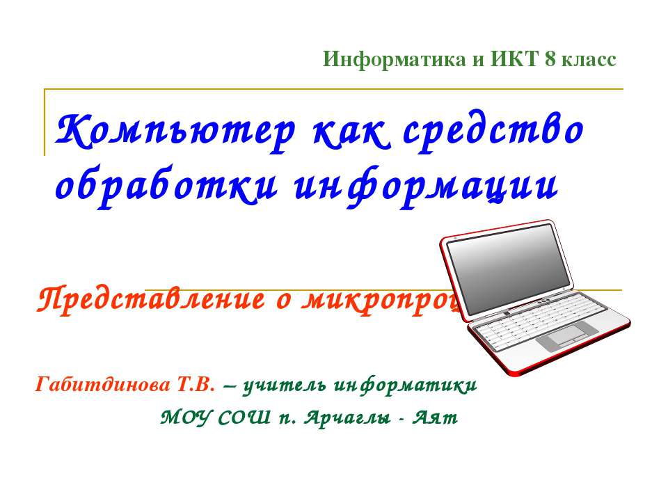 Компьютер как средство обработки информации Представление о микропроцессоре Габитдинова Т.В. – учитель информатики МОУ СОШ п. Арчаглы - Аят Информатика и ИКТ 8 класс