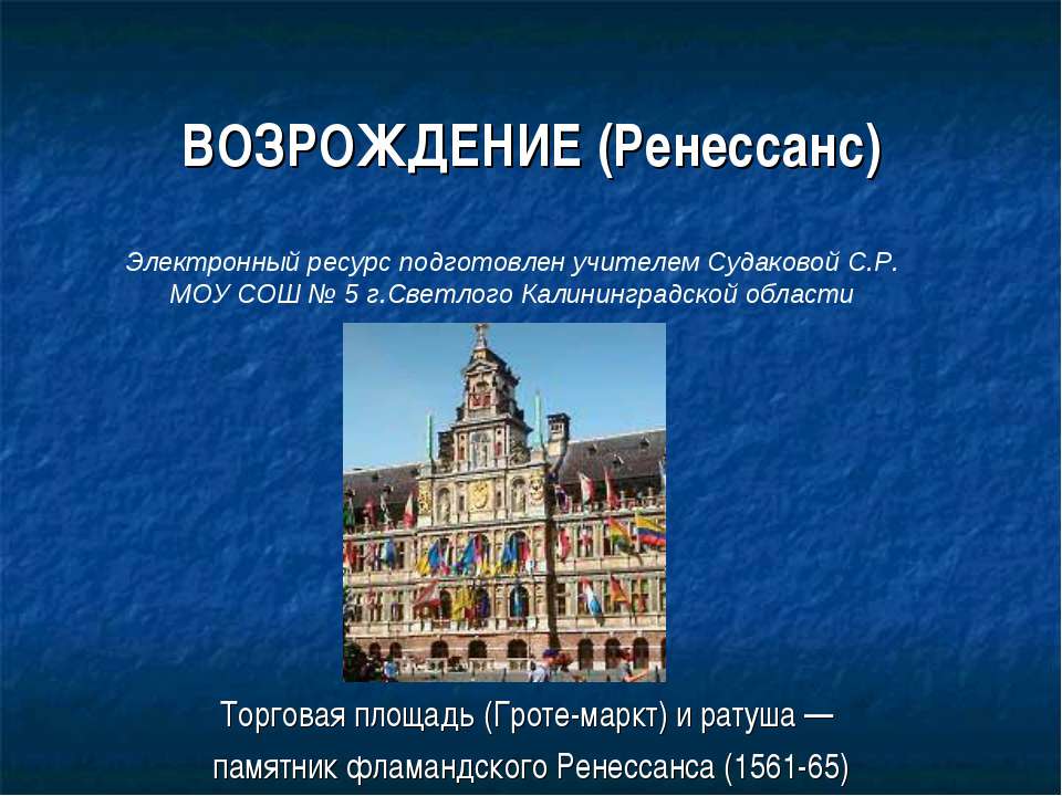ВОЗРОЖДЕНИЕ (Ренессанс) Торговая площадь (Гроте-маркт) и ратуша — памятник фламандского Ренессанса (1561-65) Электронный ресурс подготовлен учителем Судаковой С.Р. МОУ СОШ № 5 г.Светлого Калининградской области