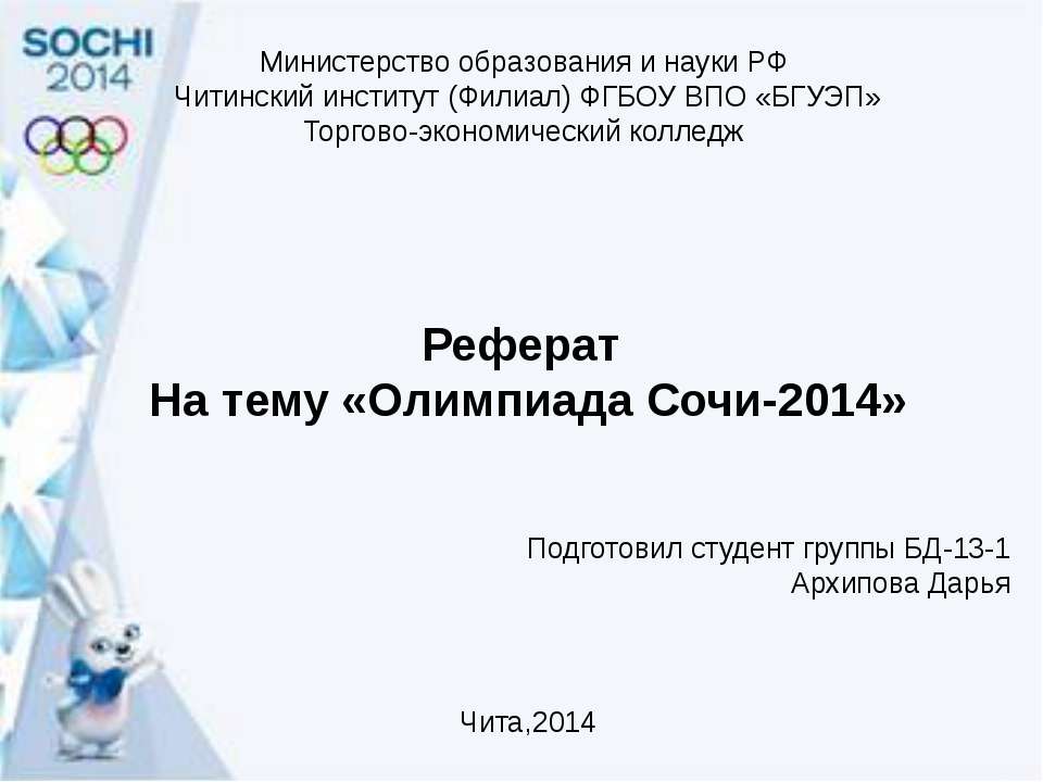 Министерство образования и науки РФ Читинский институт (Филиал) ФГБОУ ВПО «БГУЭП» Торгово-экономический колледж Реферат На тему «Олимпиада Сочи-2014» Подготовил студент группы БД-13-1 Архипова Дарья Чита,2014