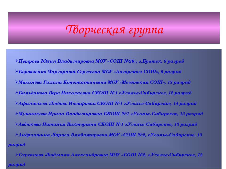 Творческая группа Петрова Юлия Владимировна МОУ «СОШ №26», г.Братск, 8 разряд Боровченко Маргарита Сергеевна МОУ «Ангарская СОШ», 9 разряд Михалёва Галина Константиновна МОУ «Мегетская СОШ», 13 разряд Бильдакова Вера Николаевна СКОШ №1 г.Усолье-Сибирское, 12 разряд Афанасьева Любовь Иосифовна СКОШ №1 г.Усолье-Сибирское, 14 разряд Мушникова Ирина Владимировна СКОШ №1 г.Усолье-Сибирское, 13 разряд Авдюкова Наталья Викторовна СКОШ №1 г.Усолье-Сибирское, 13 разряд Андриишина Лариса Владимировна МОУ «СОШ №2, г.Усолье-Сибирское, 13 разряд Сурганова Людмила Александровна МОУ «СОШ №2, г.Усолье-Сибирское, 12 разряд Сикора Валентина Николаевна МОУ «СОШ №39», г.Братск, 12 разряд