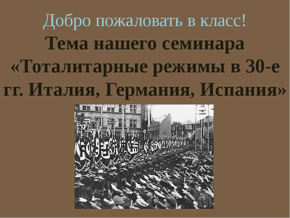 Тема нашего семинара «Тоталитарные режимы в 30-е гг. Италия, Германия, Испания» Добро пожаловать в класс!