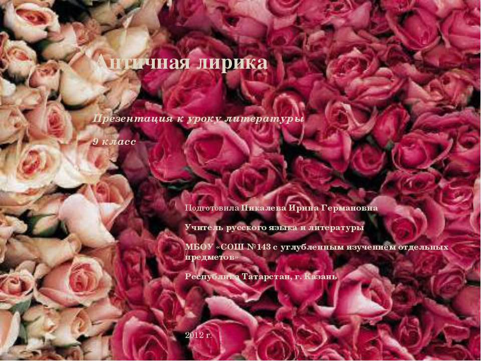 Античная лирика Подготовила Пикалева Ирина Германовна Учитель русского языка и литературы МБОУ «СОШ №143 с углубленным изучением отдельных предметов» Республика Татарстан, г. Казань 2012 г. Презентация к уроку литературы 9 класс