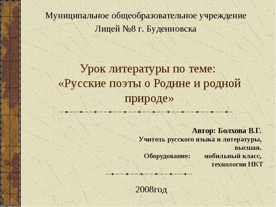 Урок литературы по теме: «Русские поэты о Родине и родной природе» Автор: Болхова В.Г. Учитель русского языка и литературы, высшая. Оборудование: мобильный класс, технология НКТ Муниципальное общеобразовательное учреждение Лицей №8 г. Буденновска 2008год