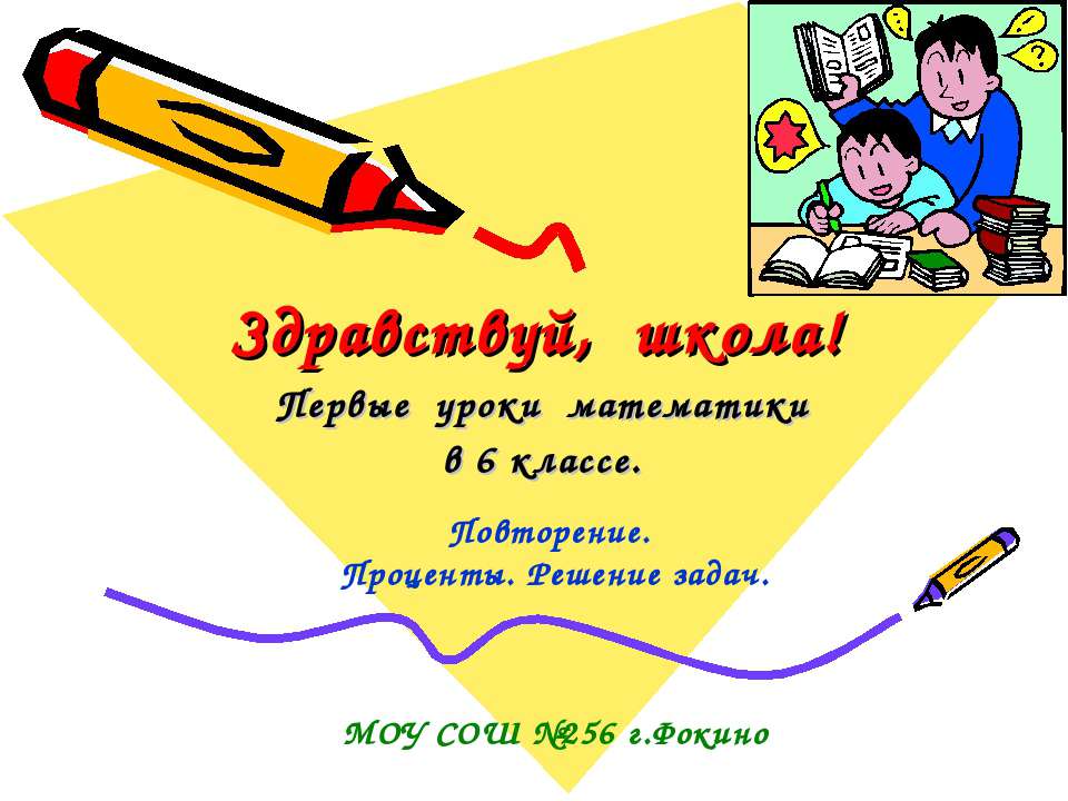 Здравствуй, школа! Первые уроки математики в 6 классе. Повторение. Проценты. Решение задач. МОУ СОШ №256 г.Фокино
