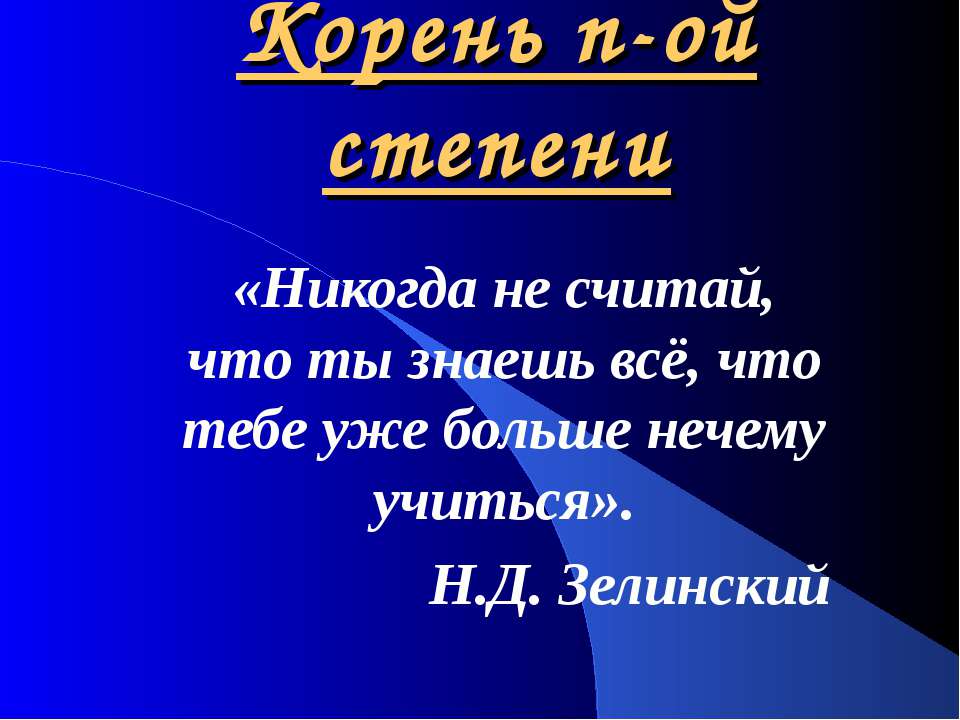 Корень n-ой степени «Никогда не считай, что ты знаешь всё, что тебе уже больше нечему учиться». Н.Д. Зелинский