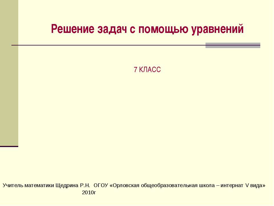 Решение задач с помощью уравнений 7 КЛАСС Учитель математики Щедрина Р.Н. ОГОУ «Орловская общеобразовательная школа – интернат V вида» 2010г