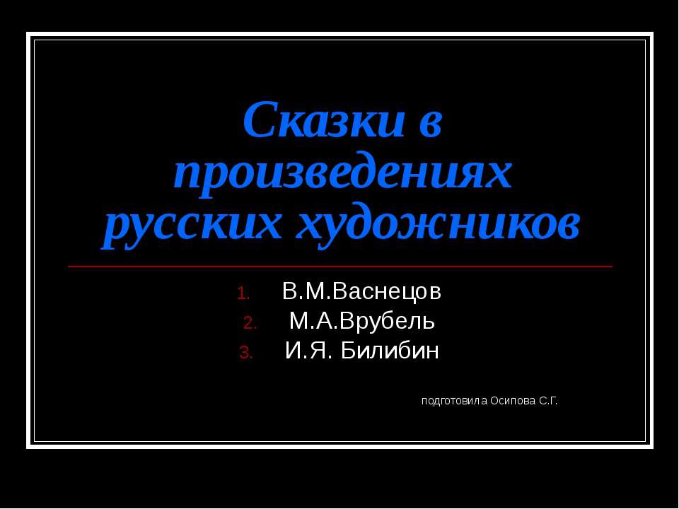 Сказки в произведениях русских художников В.М.Васнецов М.А.Врубель И.Я. Билибин подготовила Осипова С.Г.