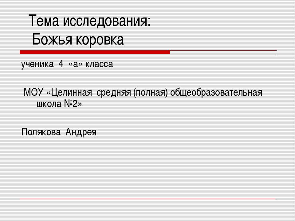 Тема исследования: Божья коровка ученика 4 «а» класса МОУ «Целинная средняя (полная) общеобразовательная школа №2» Полякова Андрея