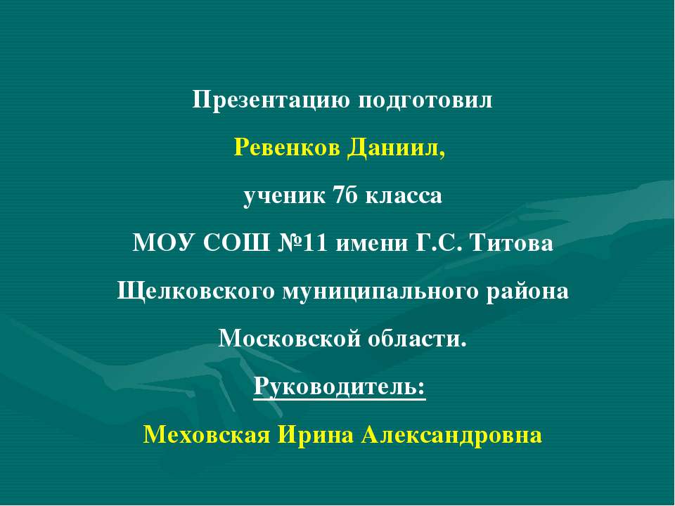 Презентацию подготовил Ревенков Даниил, ученик 7б класса МОУ СОШ №11 имени Г.С. Титова Щелковского муниципального района Московской области. Руководитель: Меховская Ирина Александровна