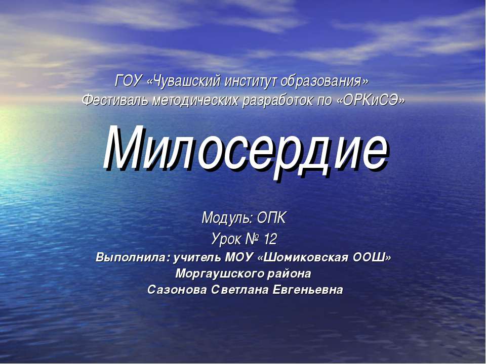 ГОУ «Чувашский институт образования» Фестиваль методических разработок по «ОРКиСЭ» Милосердие Модуль: ОПК Урок № 12 Выполнила: учитель МОУ «Шомиковская ООШ» Моргаушского района Сазонова Светлана Евгеньевна