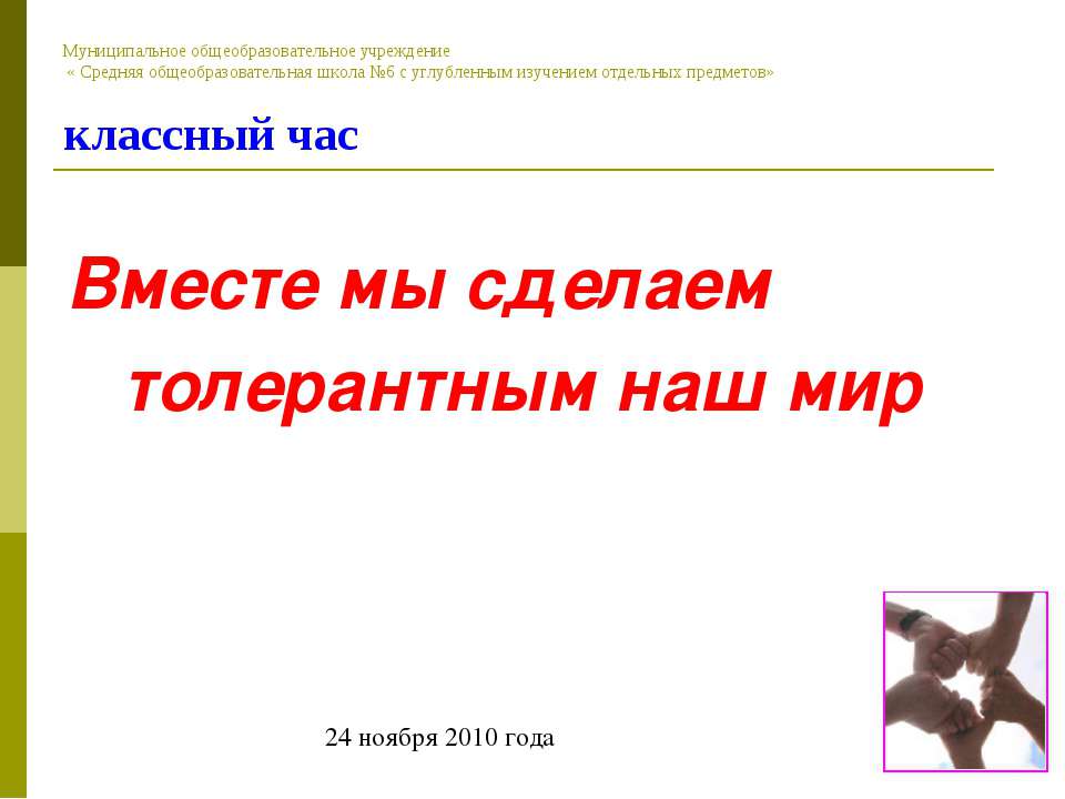 Муниципальное общеобразовательное учреждение « Средняя общеобразовательная школа №6 с углубленным изучением отдельных предметов» классный час Вместе мы сделаем толерантным наш мир 24 ноября 2010 года