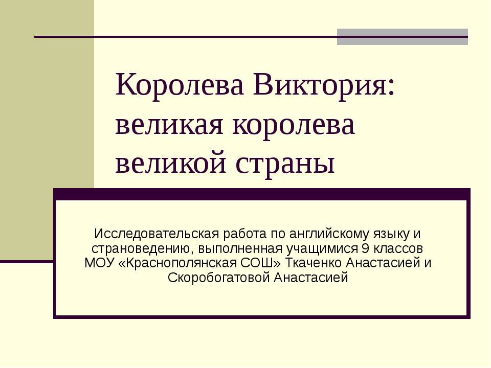 Королева Виктория: великая королева великой страны Исследовательская работа по английскому языку и страноведению, выполненная учащимися 9 классов МОУ «Краснополянская СОШ» Ткаченко Анастасией и Скоробогатовой Анастасией