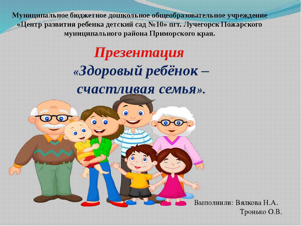Презентация «Здоровый ребёнок – счастливая семья». Муниципальное бюджетное дошкольное общеобразовательное учреждение «Центр развития ребенка детский сад №10» пгт. Лучегорск Пожарского муниципального района Приморского края. Выполнили: Вялкова Н.А. Тронько О.В.