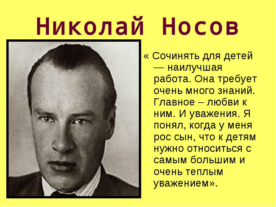 Николай Носов « Сочинять для детей — наилучшая работа. Она требует очень много знаний. Главное – любви к ним. И уважения. Я понял, когда у меня рос сын, что к детям нужно относиться с самым большим и очень теплым уважением».