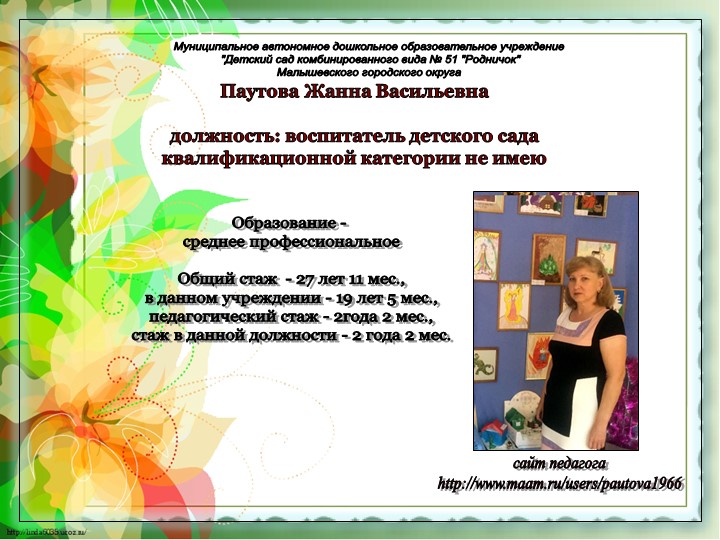 2019 год – «Нормативно-правовое и методическое обеспечение процесса образования детей с ОВЗ в условиях ДОО» (16 часов), «Современные методы игровой деятельности в работе с дошкольниками» (16 часов), «Планирование, реализация и анализ образовательной работы педагога с детьми раннего и дошкольного возраста в соответствии с ФГОС дошкольного образования» (24 часов).