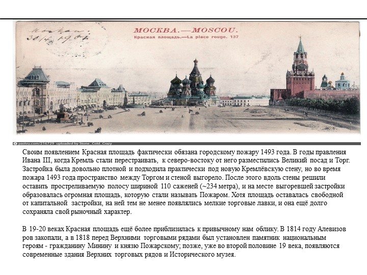 В далеком XV веке здесь случился пожар, страшный по своим последствиям — выгорело все, что могло гореть, остались лишь кремлевские стены и Торг (так называлась в те времена площадь у Кремля).