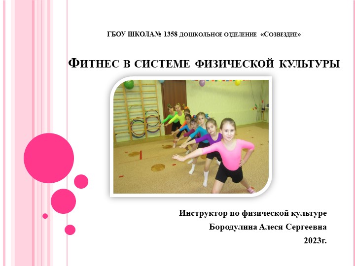 Я, Бородулина Алеся Сергеевна работаю в ГБОУ Школа 1358 , в дошкольном отделении «Солнышко». Физическое воспитание осуществляется в соответствии с образовательной программой «Детство» и рабочей программой по физическому воспитанию для детей дошкольного возраста.