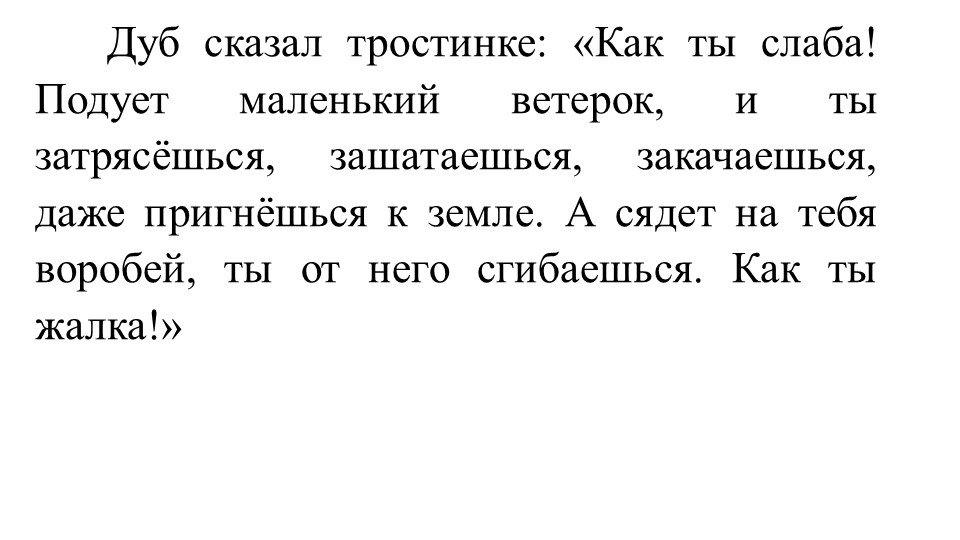 Дуб сказал тростинке: «Как ты слаба! Подует маленький ветерок, и ты затрясёшься, зашатаешься, закачаешься, даже пригнёшься к земле. А сядет на тебя воробей, ты от него сгибаешься. Как ты жалка!»