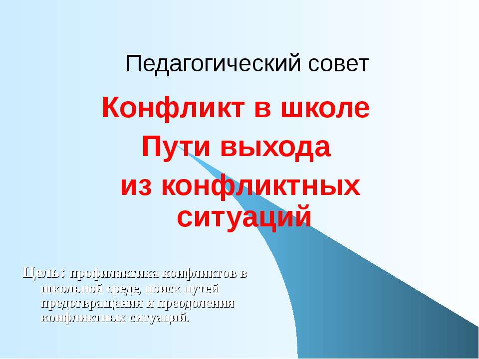 Педагогический совет Конфликт в школе Пути выхода из конфликтных ситуаций Цель: профилактика конфликтов в школьной среде, поиск путей предотвращения и преодоления конфликтных ситуаций.
