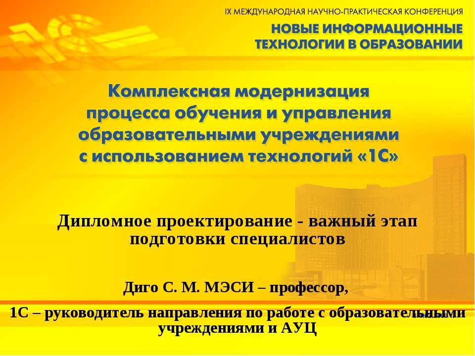 - Дипломное проектирование - важный этап подготовки специалистов Диго С. М. МЭСИ – профессор, 1С – руководитель направления по работе с образовательными учреждениями и АУЦ 3-4.02.2009 г.