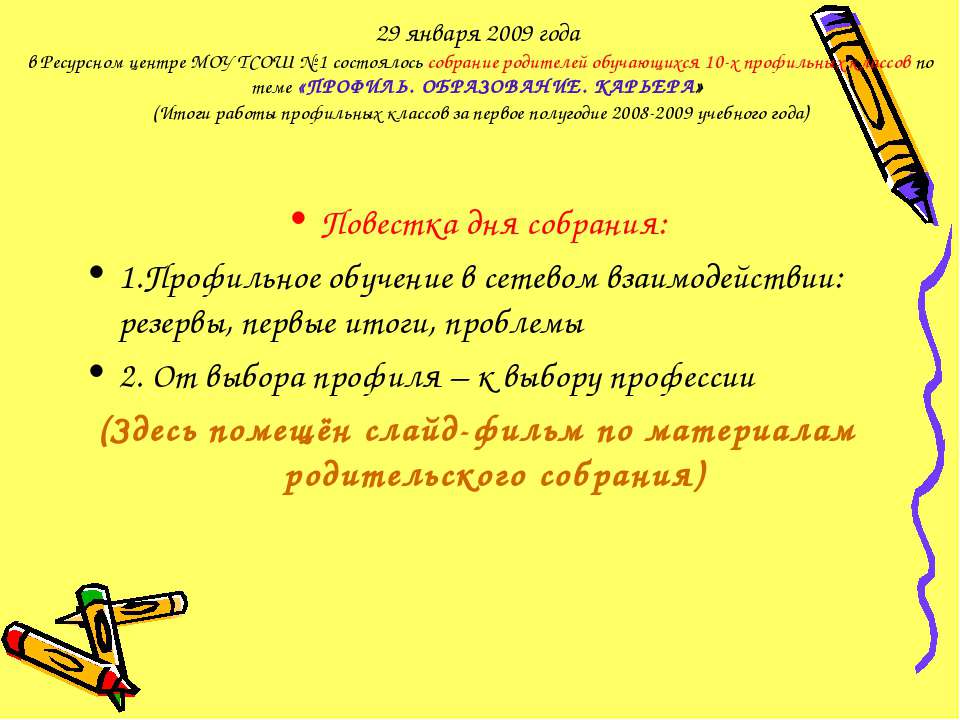 29 января 2009 года в Ресурсном центре МОУ ТСОШ № 1 состоялось собрание родителей обучающихся 10-х профильных классов по теме «ПРОФИЛЬ. ОБРАЗОВАНИЕ. КАРЬЕРА» (Итоги работы профильных классов за первое полугодие 2008-2009 учебного года) Повестка дня собрания: 1.Профильное обучение в сетевом взаимодействии: резервы, первые итоги, проблемы 2. От выбора профиля – к выбору профессии (Здесь помещён слайд-фильм по материалам родительского собрания)