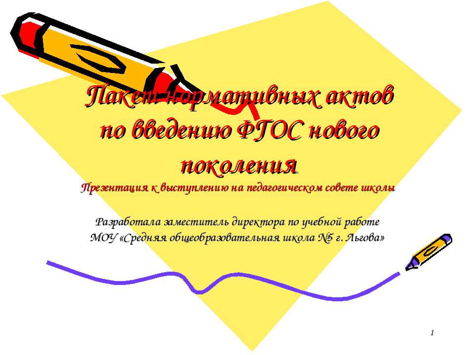 Пакет нормативных актов по введению ФГОС нового поколения Презентация к выступлению на педагогическом совете школы Разработала заместитель директора по учебной работе МОУ «Средняя общеобразовательная школа №5 г. Льгова» *