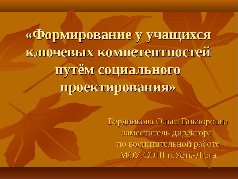 «Формирование у учащихся ключевых компетентностей путём социального проектирования» Бердникова Ольга Викторовна заместитель директора по воспитательной работе МОУ СОШ п.Усть-Люга