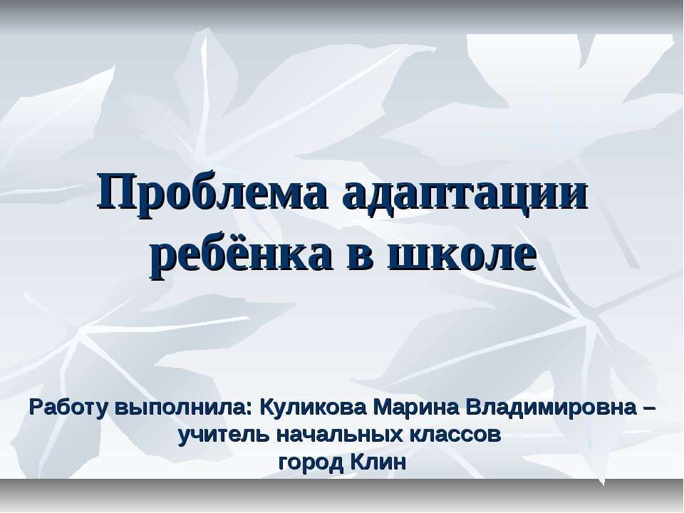 Проблема адаптации ребёнка в школе Работу выполнила: Куликова Марина Владимировна – учитель начальных классов город Клин