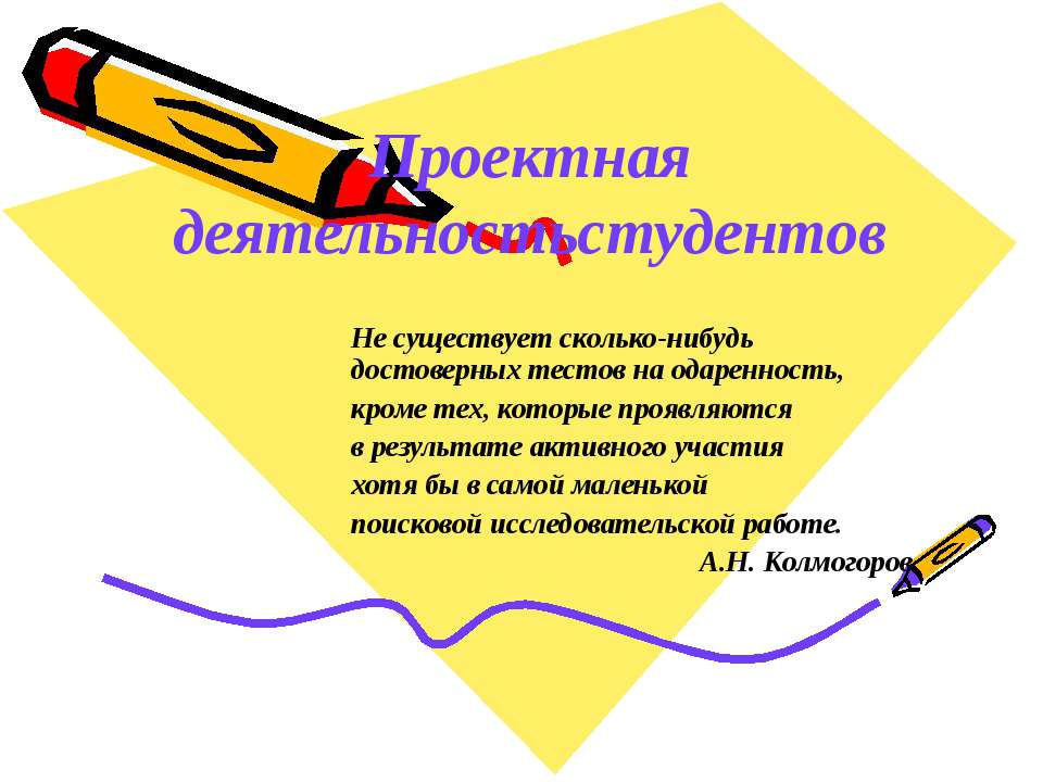 Проектная деятельностьстудентов Не существует сколько-нибудь достоверных тестов на одаренность, кроме тех, которые проявляются в результате активного участия хотя бы в самой маленькой поисковой исследовательской работе. А.Н. Колмогоров
