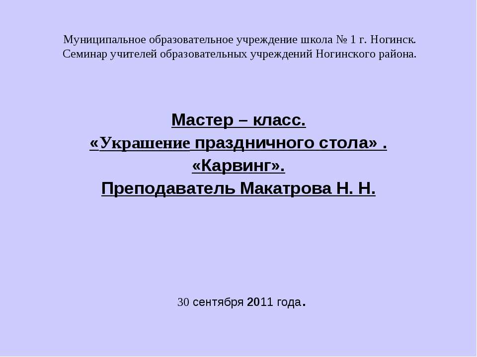 Муниципальное образовательное учреждение школа № 1 г. Ногинск. Семинар учителей образовательных учреждений Ногинского района. Мастер – класс. «Украшение праздничного стола» . «Карвинг». Преподаватель Макатрова Н. Н. 30 сентября 2011 года.